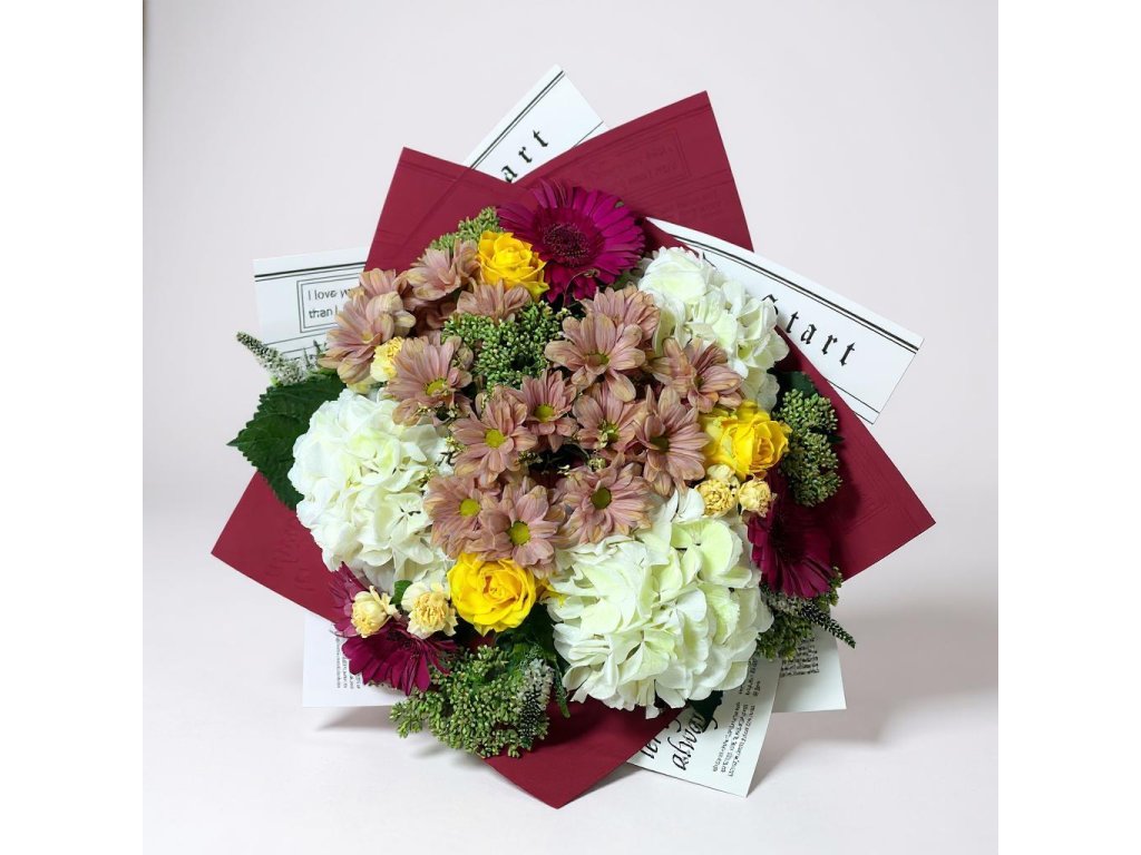 Tato kompozice spojuje v sobě teplo podzimních barev s čerstvostí jarních tónů, což vytváří harmonický a veselý dojem. Každý květ má svou roli v této barevné symfonii - od něžných bílých hortenzií přes zářivé žluté růže až po výrazné fialové gerbery.