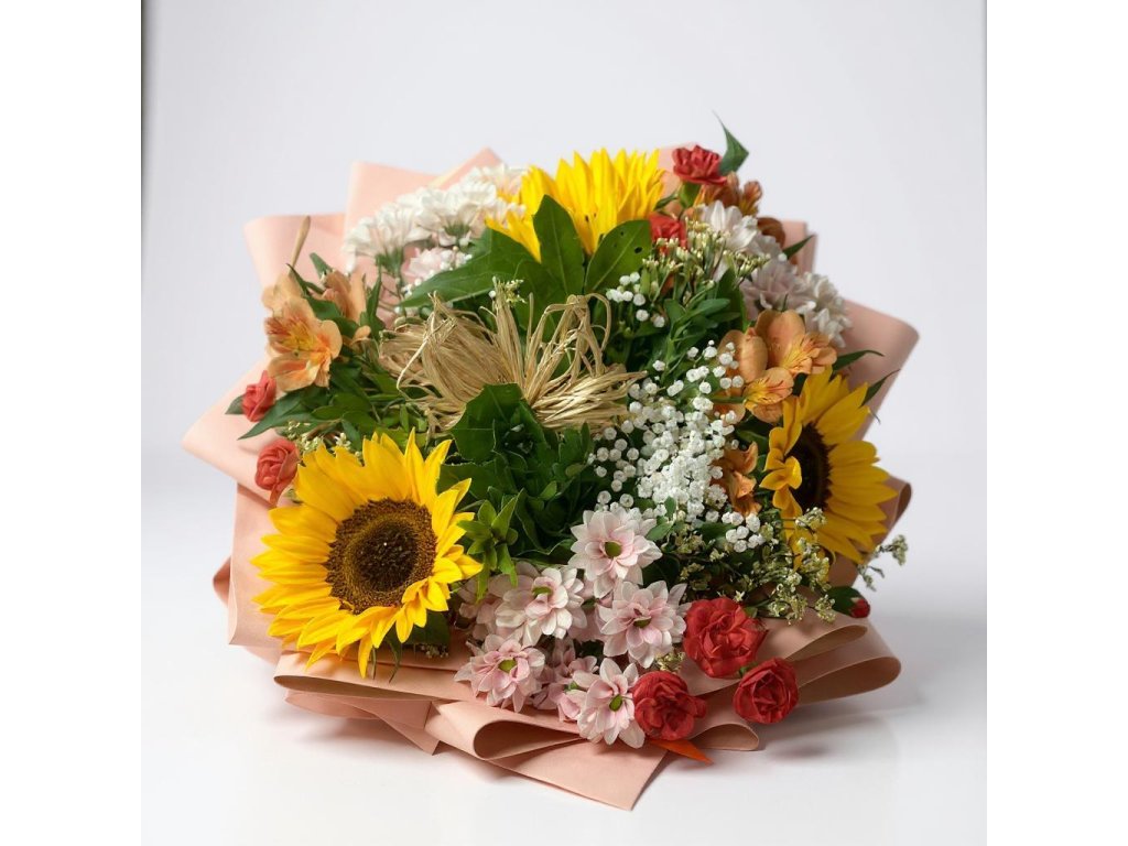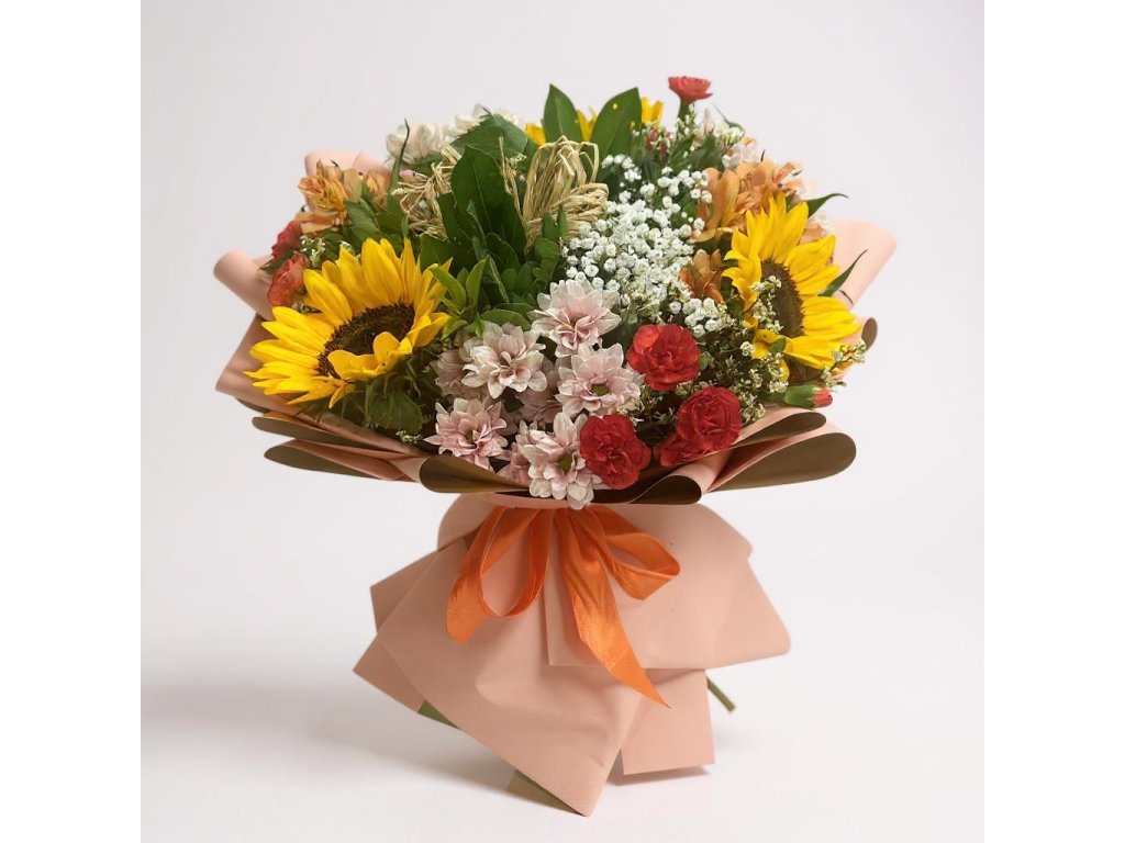 Živá a veselá kytice s dominantními slunečnicemi a oranžovým balením. Výraz radosti a pozitivní energie!