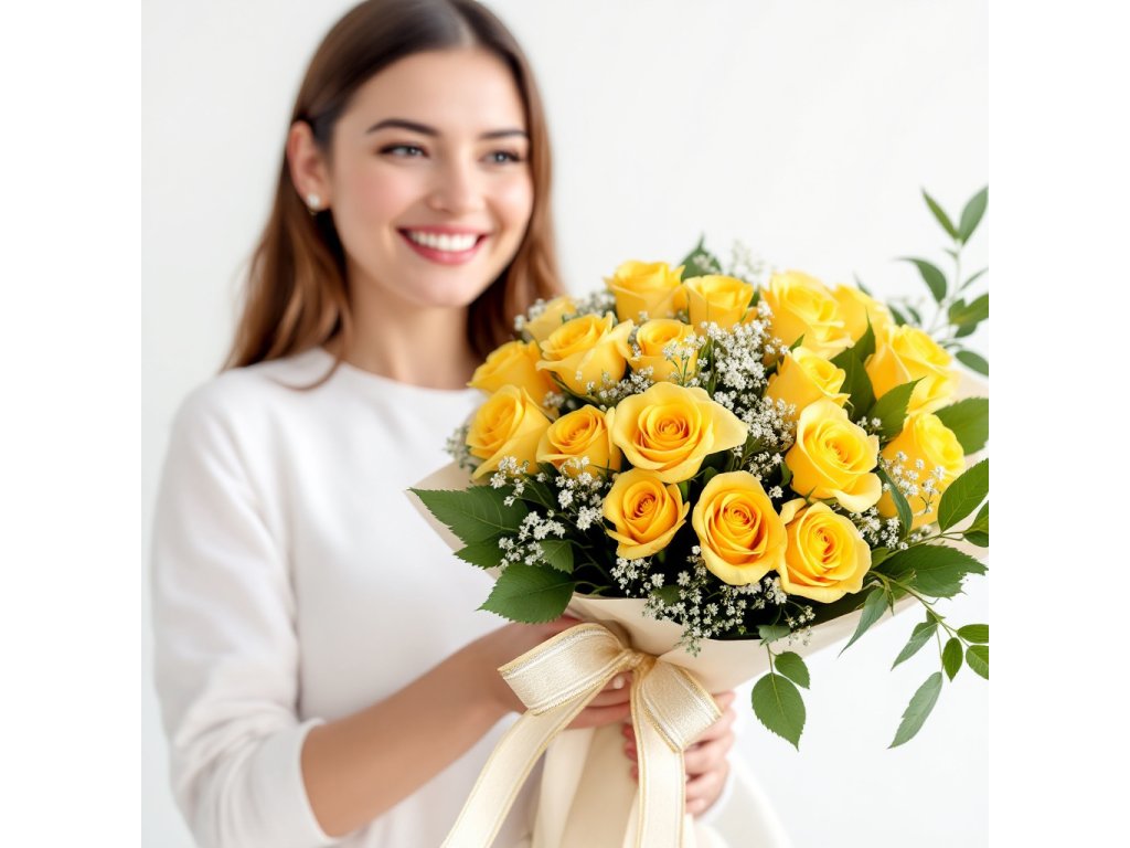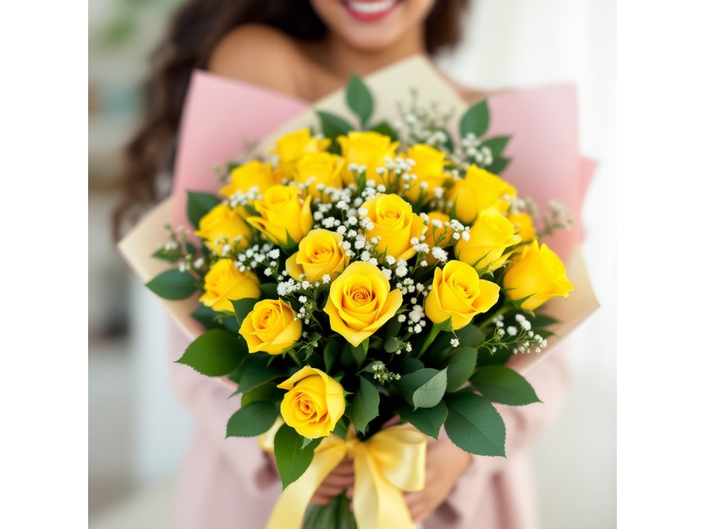 Tento nádherný pugét obsahuje devatenáct žlutých růží, které jsou známé svou zářivou barvou a elegantním vzhledem. Žluté růže jsou symbolem přátelství, radosti a optimismu, což z nich činí ideální volbu pro různé oslavy a příležitosti vyžadující radostný nádech. Růže jsou vkusně doplněny jemnou gypsophilou, která dodává celému aranžmá romantický a lehký šarm.