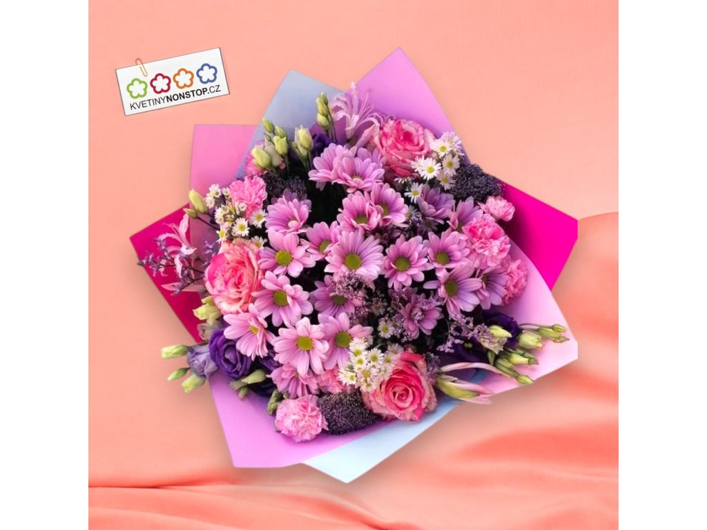 Romantická kytice v něžných růžových tónech, která dokonale vyjadřuje lásku, něžnost a obdiv. Tato půvabná kompozice kombinuje elegantní růže s jemnými chryzantémami a drobnými santinkami v harmonických růžových odstínech.