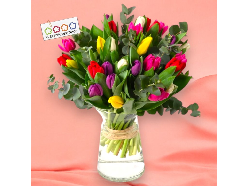 Kytice 21 Tulipánů s Eukalyptem – Mix Barev a Svěží Vůně | Květiny Nonstop Praha