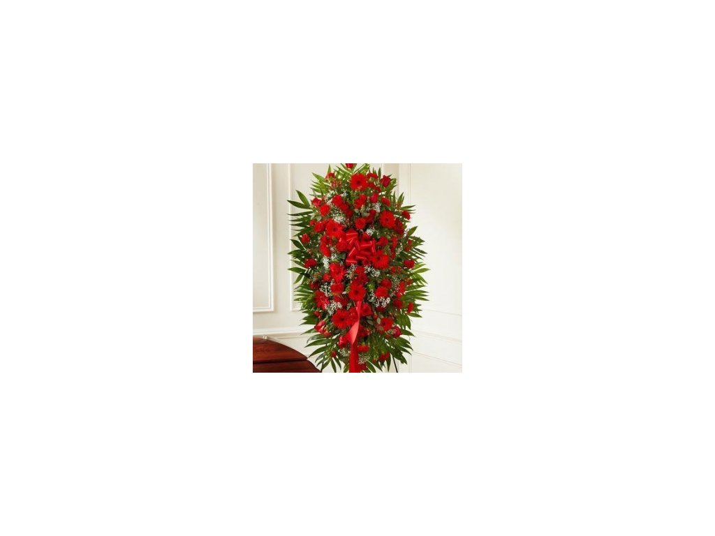 Vypichovaná červená ikebana z živých květin představuje sofistikovanou volbu pro smuteční obřady - kombinuje estetickou krásu s hlubokým symbolickým významem prostřednictvím výrazných červených tónů.