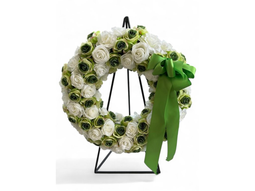 Nadčasový bílo-zelený smuteční věnec z umělých květin představuje symbol naděje a věčného života. Bílé a světle zelené smuteční růže vytváří jemné pohřební aranžmá vhodné pro smuteční obřady.