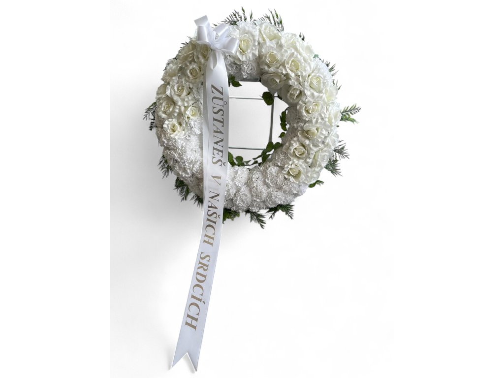 Smuteční věnec se stužkou je klasickou volbou pro vyjádření posledního pozdravu. Bílá barva symbolizuje čistotu a mír, zatímco jehličnaté větve představují věčnost. Ideální smuteční květinová dekorace pro zimní pohřby nebo tradiční ceremoníe.