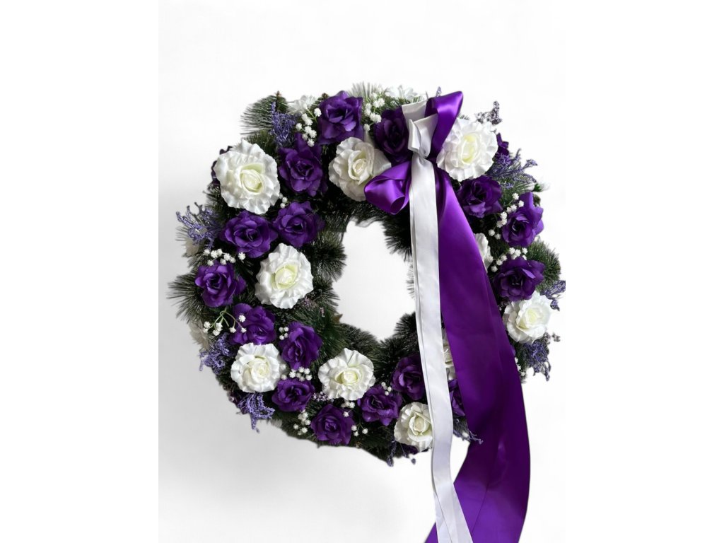 Výjimečný smuteční věnec s jehličím v elegantní kombinaci fialových a bílých květin. Tento pohřební věnec spojuje tradiční jehličnaté větvičky s nádhernými umělými růžemi v kontrastních barvách. Dekorativní fialová stuha dodává celé kompozici slavnostní charakter.