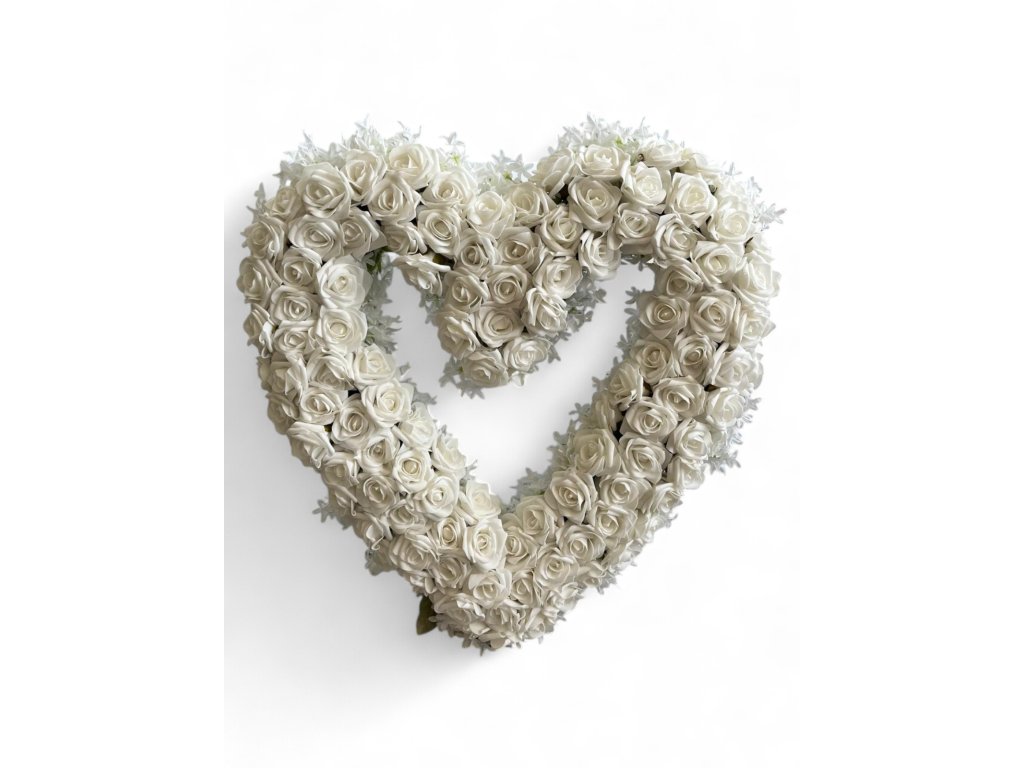 Věnec ve tvaru srdce je ideální pro vyjádření hlubokých citů a věčné lásky k zesnulému. Jednoduché, ale působivé provedení z umělých růží zajišťuje důstojný vzhled a dlouhotrvající krásu této smuteční květinové dekorace.