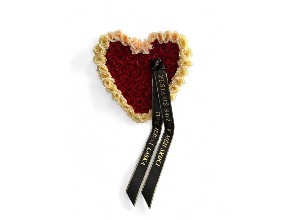 Výjimečné smuteční aranžmá ve tvaru srdce z červených růží obklopených zlatými růžemi. Tento pohřební věnec vyjadřuje hlubokou lásku a úctu k zesnulému. Tradiční smuteční stuha s možností osobního věnování dotváří důstojný vzhled této kondolenční kytice.