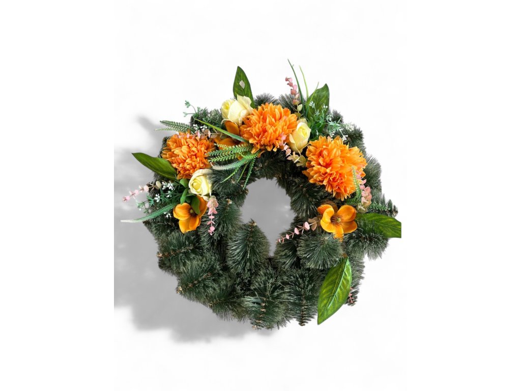 Tradiční smuteční věnec v teplých podzimních barvách kombinuje žluté chryzantémy, lilie a bohaté jehličnaté větve. Tento pohřební věnec představuje symbol věčnosti a důstojného rozloučení. Podzimní smuteční květiny v zlatavých a oranžových tónech vyjadřují vděčnost za společně prožité chvíle.