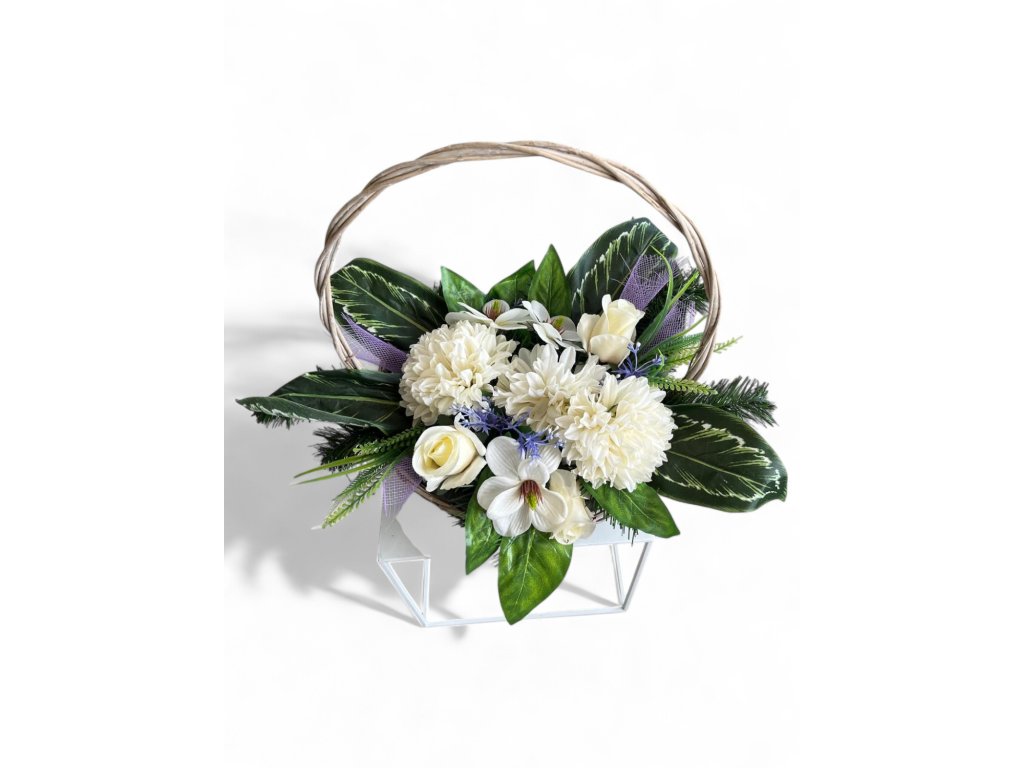 Elegantní pohřební koš naplněný bílými chryzantémami, růžemi a liliemi vytváří harmonickou kompozici. Tento smuteční aranžmán je doplněn jemnou fialovou stuhou a čerstvým jehličím v přírodním proutěném košíku. Pohřební květiny v neutrálních barvách s barevným akcentem jsou vhodné pro všechny typy pohřebních služeb. Koš je ideální jako smuteční dar nebo pohřební dekorace pro obřadní síň. Kvalitní umělé květiny zajišťují dlouhotrvající krásu této věnce na rozloučenou.