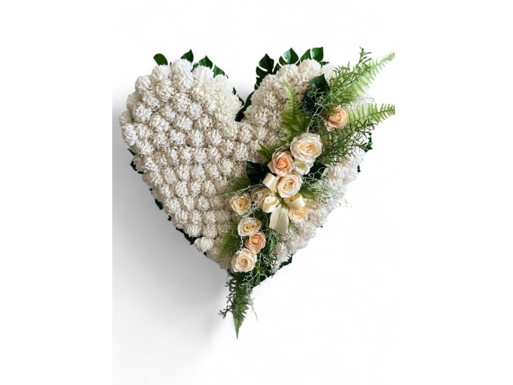 Pohřební srdce s chryzantémami a krémovými růžemi