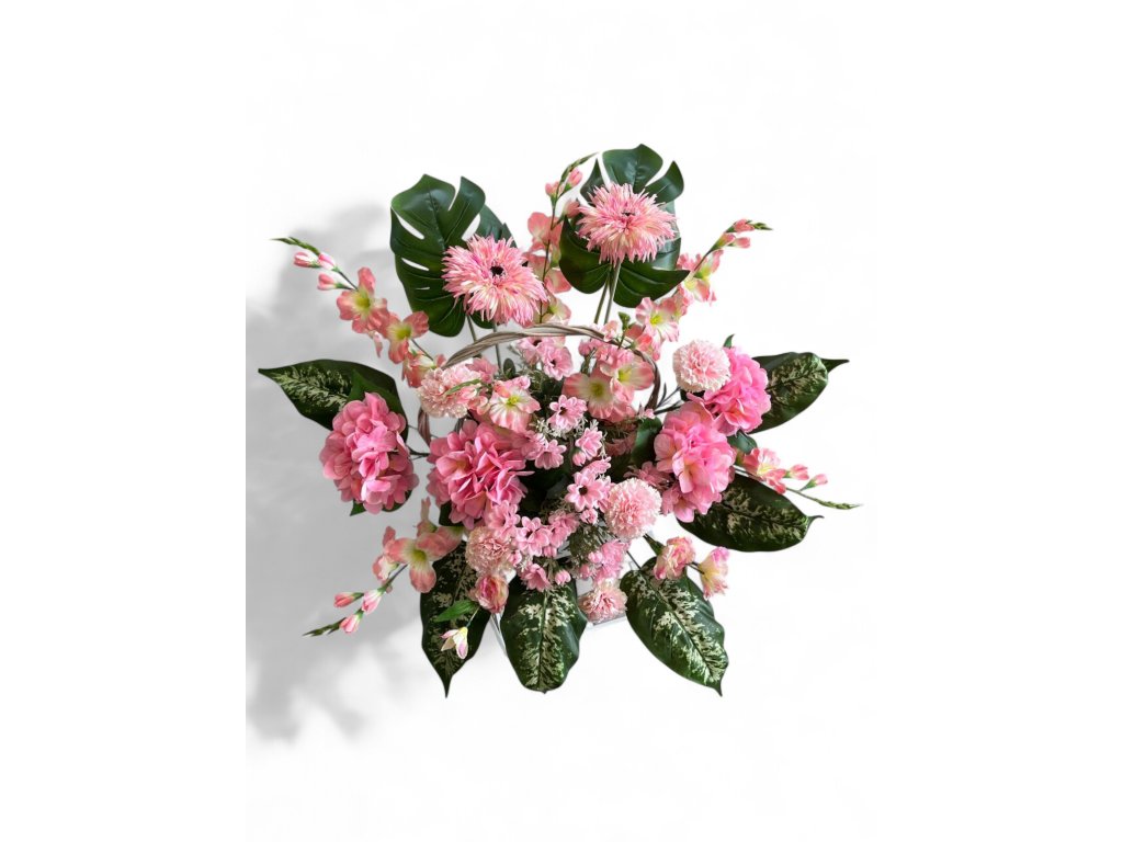 Půvabné smuteční aranžmá v růžových odstínech doplněné exotickými zelenými listy. Tato pohřební dekorace vyjadřuje lásku, něhu a krásné vzpomínky prostřednictvím jemné barevné harmonie.