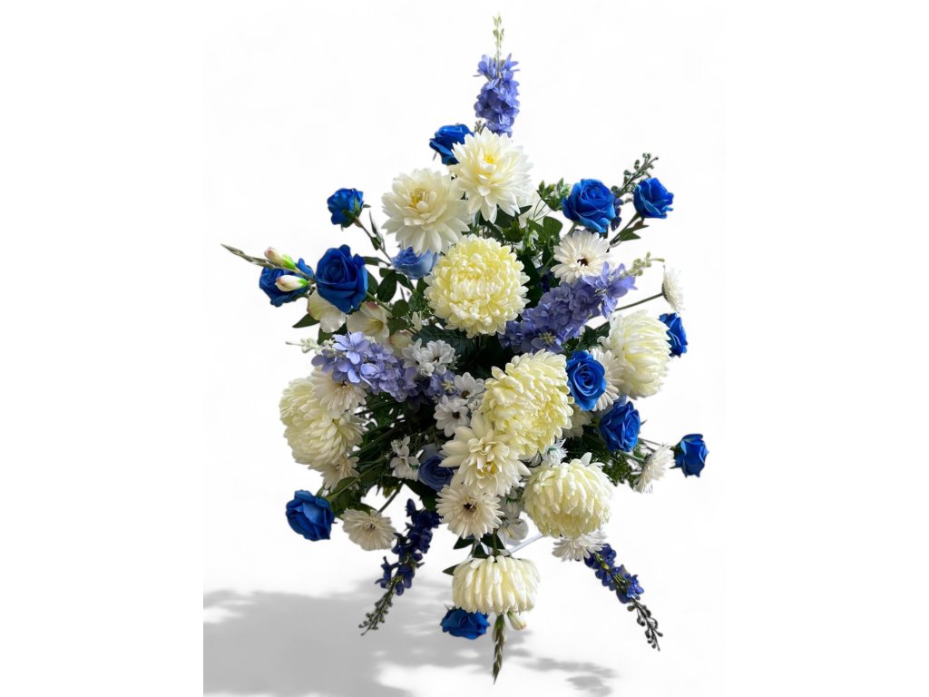 Jemná smuteční kytice v modro-bílé barevné kombinaci s přídavkem fialové levandule. Toto pohřební aranžmá vyjadřuje klid, mír a věčnou vzpomínku na zesnulého prostřednictvím harmonické kombinace květin.
