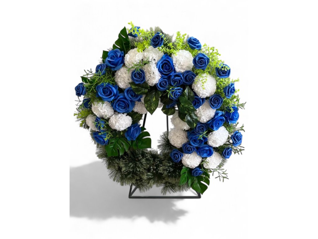 Tento elegantní pohřební věnec vyjadřuje hlubokou úctu a věčnou vzpomínku prostřednictvím jemné kombinace královských modrých růží a čistě bílých chryzantém. Smuteční dekorace je doplněna jehličnatou zelení a dekorativními větvičkami, které symbolizují věčnost a naději.