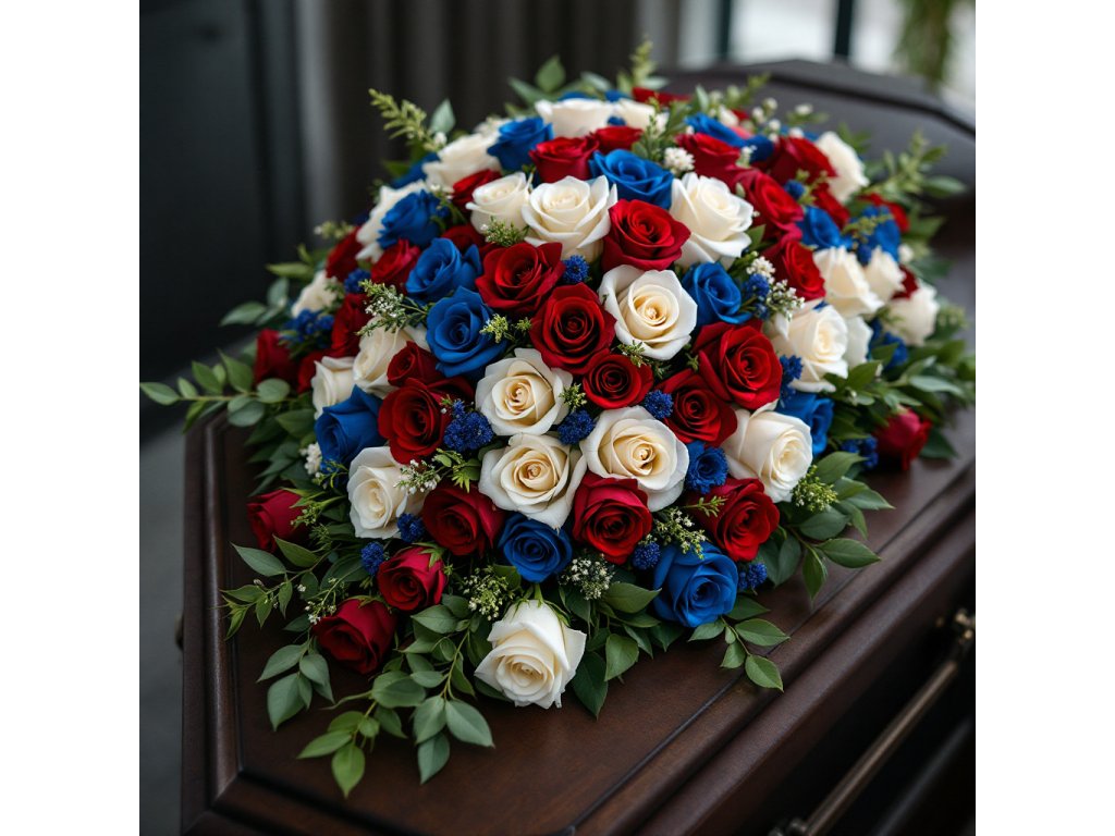 Umělá ikebana na rakevTrikolora květinové aranžmáSmuteční květinyDůstojné aranžmá na rakevUmělé růžeSmuteční dekoraceKvětinová pietní výzdobaElegantní květinové aranžmá