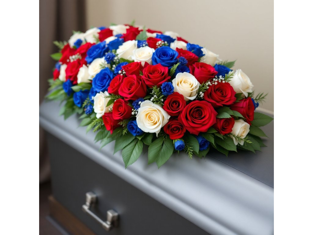 Umělá ikebana na rakevTrikolora smuteční aranžmáUmělé růžeSmuteční květinová dekoraceKvětinové aranžmá na rakevElegantní smuteční výzdobaDekorace na hrobKvětinová aranžmá s růžemi