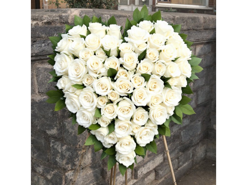 Bílé smuteční srdceKvětinové aranžmá s růžemiUmělé květiny na hrobSmuteční dekoraceUmělé květinové srdceSmuteční srdce bíléKvětinová výzdoba na pohřebPietní květinová aranžmá