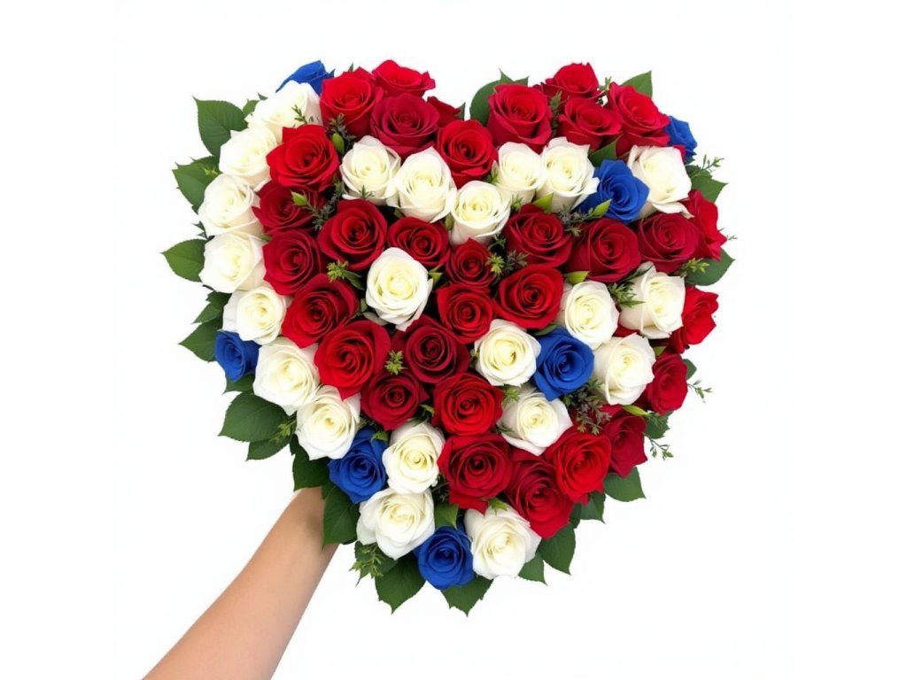 Smuteční srdce trikoloraUmělé květinové aranžmá s trikolorouSmuteční dekorace s růžemiTrikolorové květinové srdceNárodní symbolika v květináchKvětinová výzdoba na hrobUmělé růže ve smutečním aranžmáElegantní pietní dekorace s trikolorou