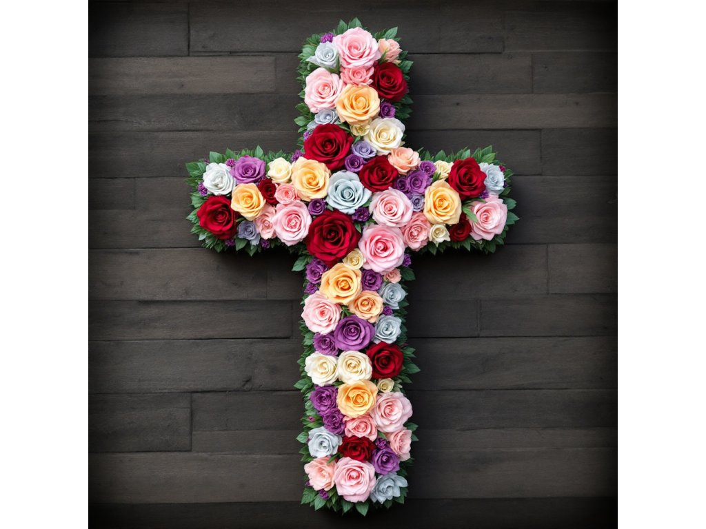 Smuteční kříž z umělých květinBarevný květinový křížPietní dekorace ve tvaru křížeKvětinová výzdoba na hrobUmělé růže ve smutečním aranžmáPohřební dekorace s růžemiElegantní aranžmá ve tvaru kříže