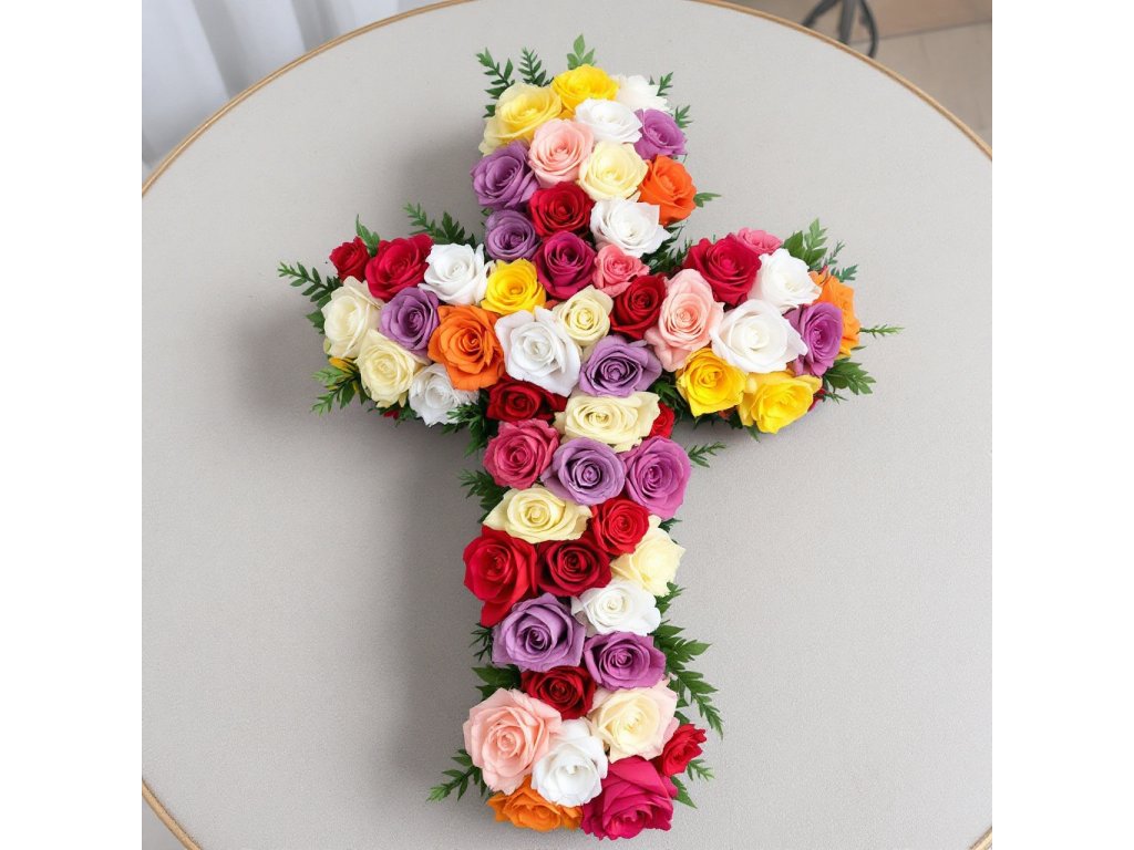 Smuteční kříž z umělých květinUmělé květinové aranžmáPietní dekorace ve tvaru křížeBarevný smuteční křížKvětinová výzdoba na hrobUmělé růže ve smutečním aranžmáDůstojná pohřební dekoraceElegantní kříž s růžemi