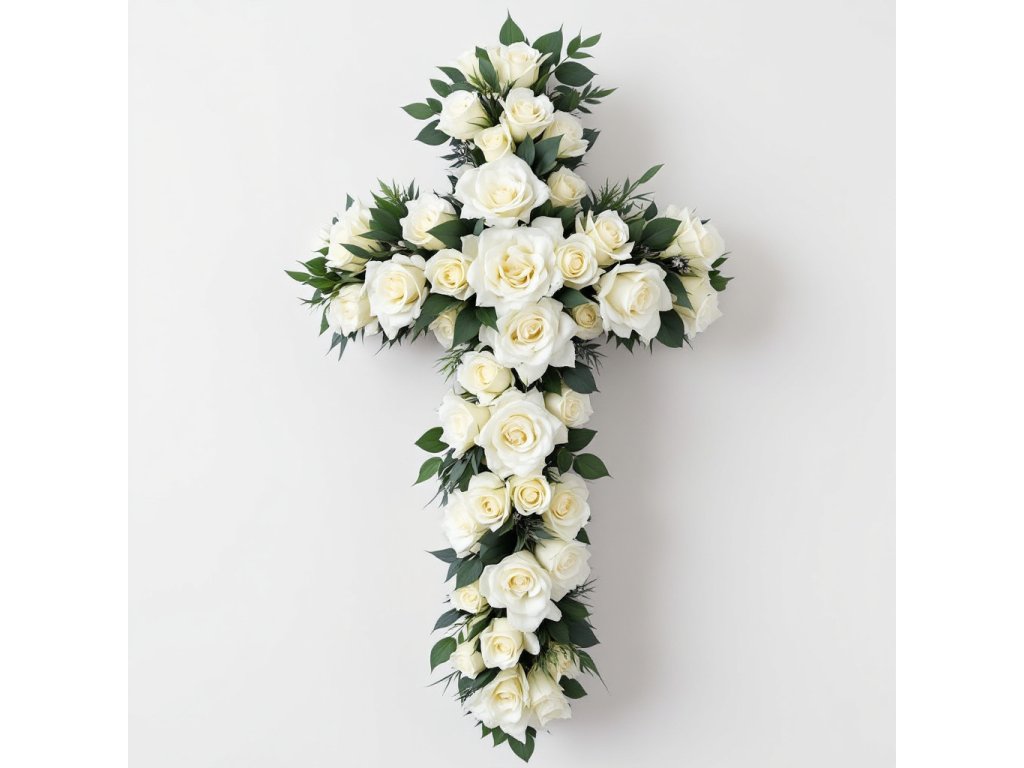 Smuteční kříž z umělých květinUmělý kříž bílýPietní dekorace ve tvaru křížeBílé růže na smuteční křížKvětinová výzdoba na hrobElegantní smuteční dekoracePohřební aranžmá s bílými růžemi