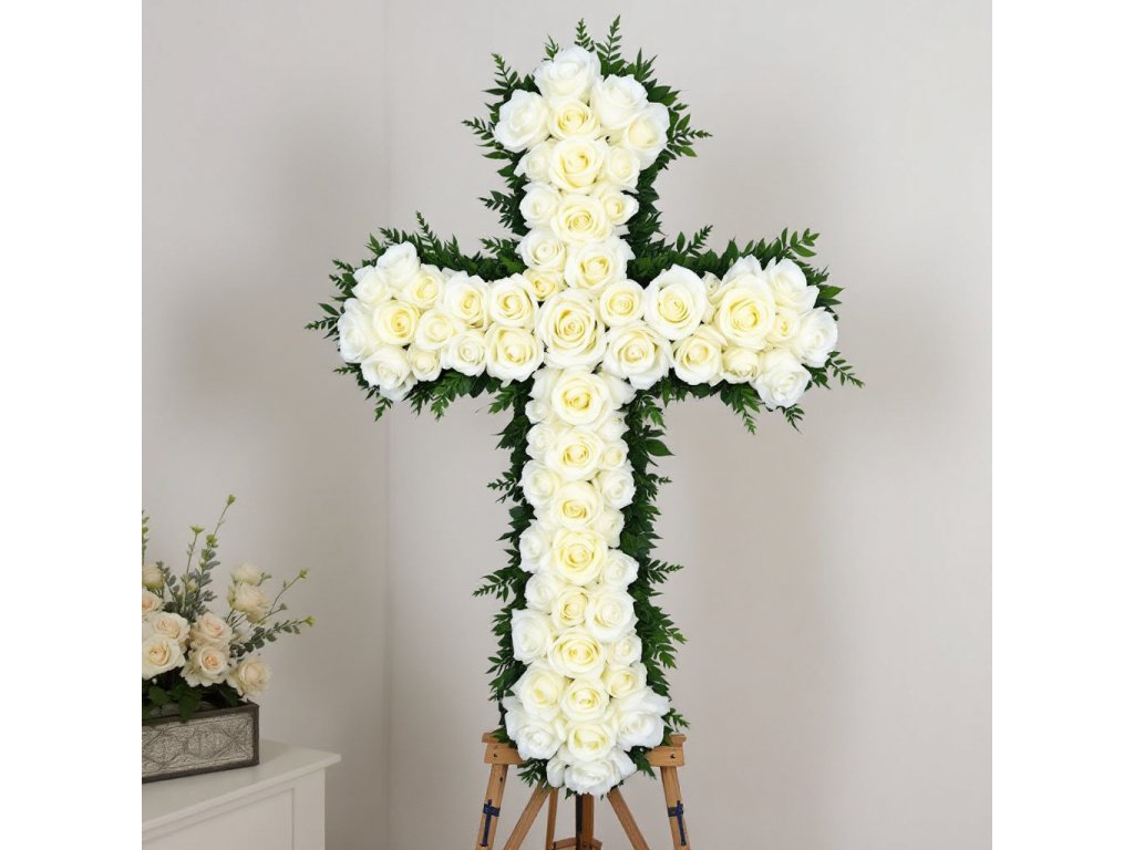 Smuteční kříž z umělých květinBílý kříž s růžemiPietní dekorace na hrobBílé růže ve smutečním aranžmáPohřební květinová výzdobaElegantní smuteční křížDůstojná dekorace na smuteční obřady