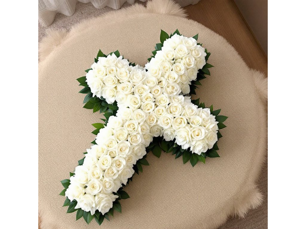 Smuteční kříž z umělých květinUmělý kříž bílýPietní dekorace ve tvaru křížeBílé růže ve smutečním aranžmáKvětinová výzdoba na hrobElegantní smuteční dekoracePohřební aranžmá s růžemi