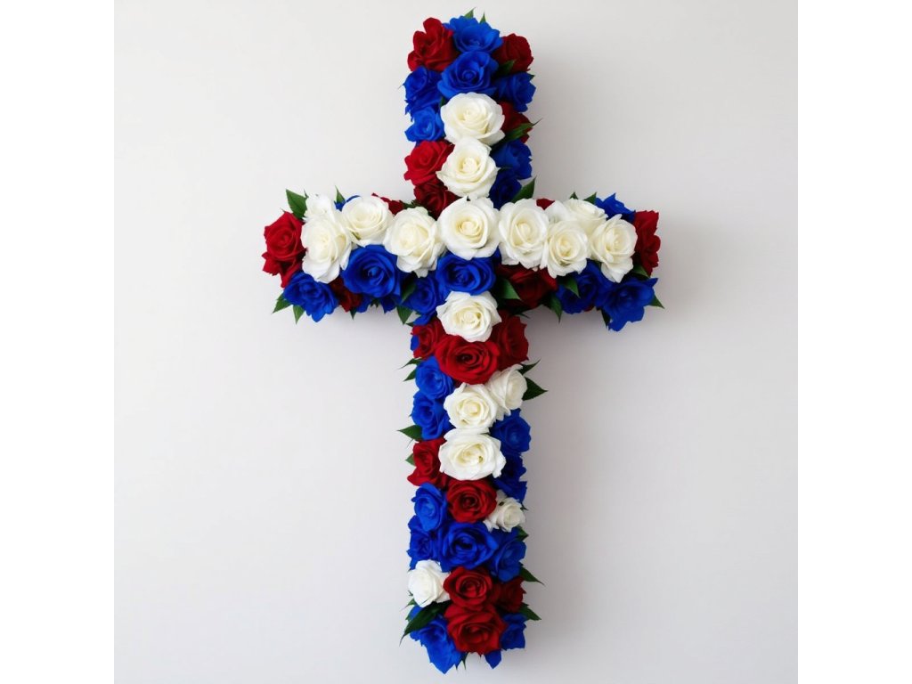 Smuteční kříž trikoloraUmělý kříž s národní symbolikouKříž z umělých růžíTrikolorový kříž na pietní akceSmuteční dekorace s trikolorouKvětinová výzdoba na hrobNárodní smuteční aranžmá