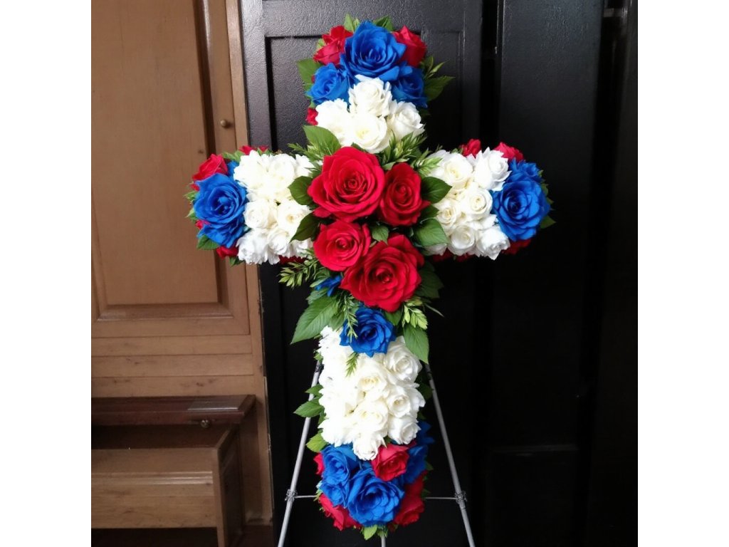 Smuteční kříž trikoloraUmělý kříž s národní symbolikouTrikolorový kříž ze smutečních květinKříž z umělých růžíSmuteční dekorace trikoloraKvětinová výzdoba na hrobNárodní pietní dekorace