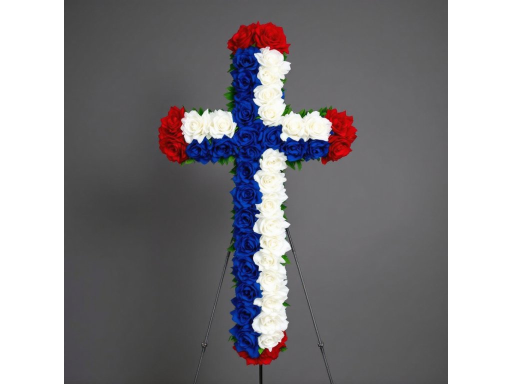 Smuteční kříž trikoloraUmělý kříž s národní symbolikouKříž z umělých růžíTrikolorový smuteční křížSmuteční dekorace s trikolorouKvětinová výzdoba na hrobNárodní smuteční aranžmá