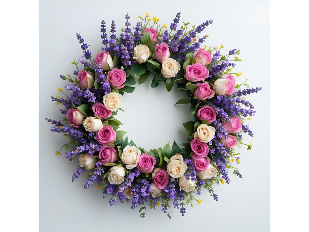 Smuteční věnec s růžovými růžemi a levandulíUmělý věnec s přírodními motivyElegantní smuteční dekorace na hrobVěnec z růží a levandulePietní květinové aranžmáVěnec s dlouhou životnostíDůstojná pohřební výzdoba