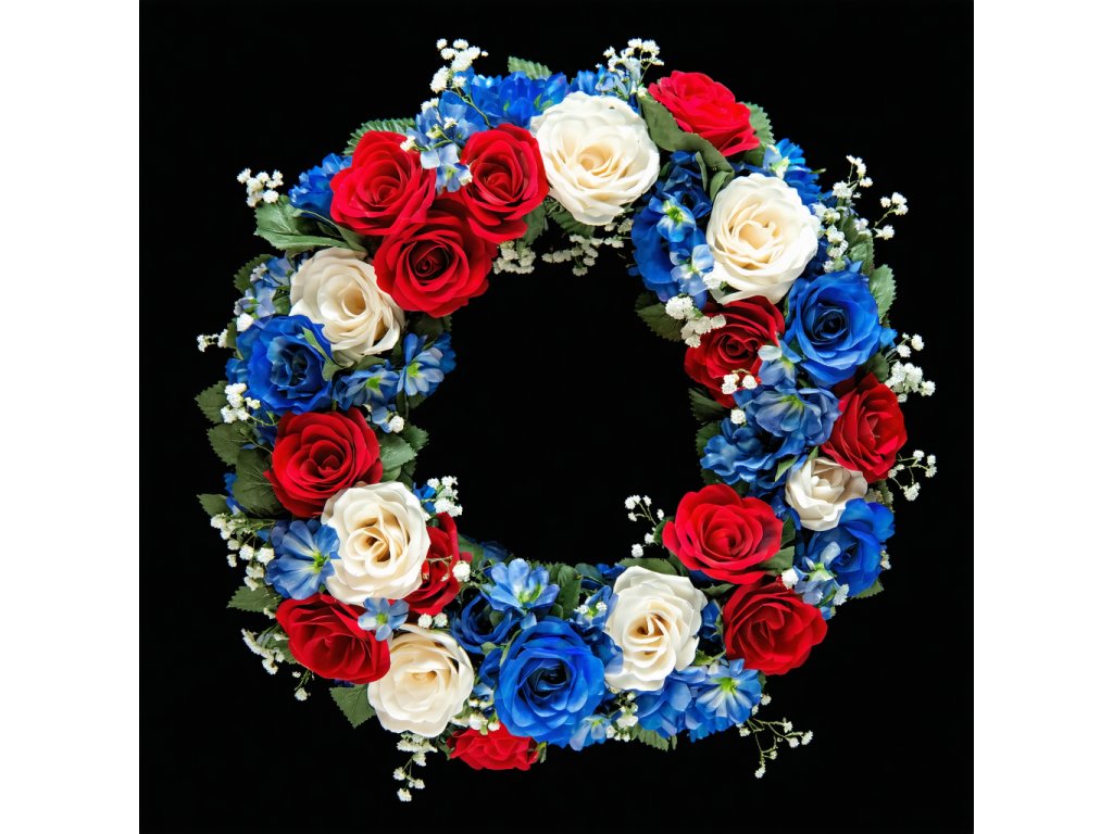 Smuteční věnec trikoloraUmělý věnec s růžemiKvětinová výzdoba na pohřebVěnec s národní symbolikouTrikolorový věnec na hrobElegantní smuteční dekoraceVěnec z umělých květinPohřební dekorace trikolora
