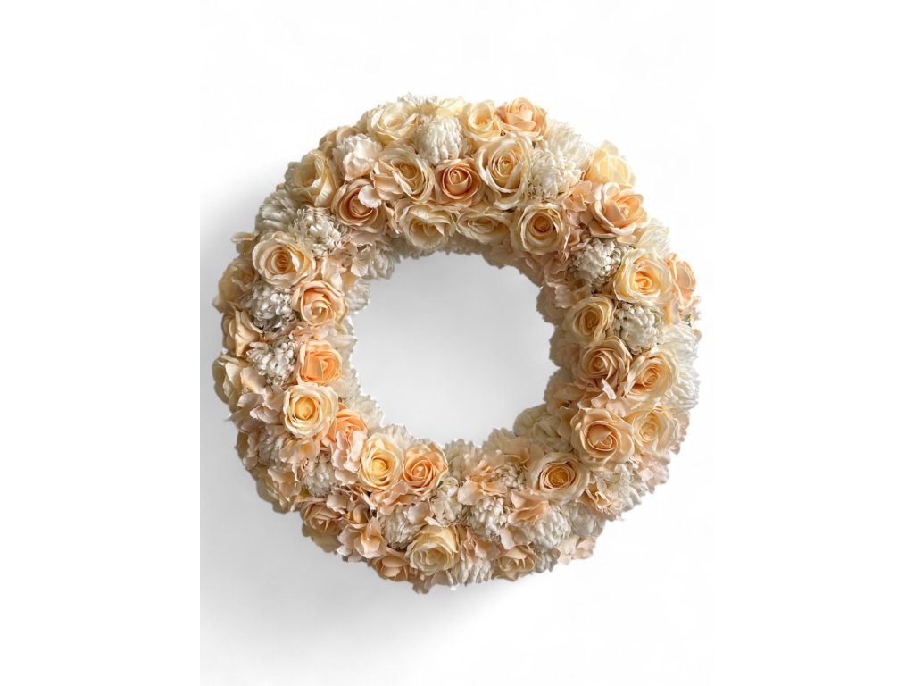 Nádherný kulatý smuteční věnec v jemných pastelových tónech kombinuje krémové, růžové a broskvové umělé růže s bílými chryzantémami. Tato pohřební květinová kompozice je obohacena o zelené listy, které dodávají přirozenost celé dekoraci.
