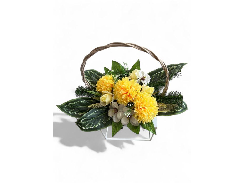 Teplé žluté smuteční aranžmá v košíku s výraznými žluto-oranžovými chryzantémami. Doplněné světlými růžemi a dekorativní zelení. Tato smuteční kytice symbolizuje světlo a naději ve smutku. Pohřební květiny v teplých barvách pro pozitivní vzpomínku na zesnulého. Kvalitní umělé květiny pro dlouhodobou výzdobu hrobu. Rozměr 30 cm. Vhodné pro smuteční obřady i trvalou výzdobu.