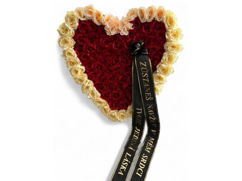 Popis produktu: Srdce je vyplněno drobnými červenými růžemi ve středu a orámováno bílými růžemi po obvodu. Elegantní černá stuha se zlatým písmem umožňuje osobní vzkaz a dodává celému aranžmá formální a důstojný charakter.