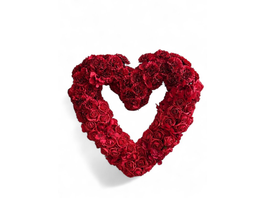 Emotivní smuteční srdce hustě pokryté červenými růžemi a karafiáty. Intenzivní červená barva vyjadřuje hlubokou lásku a věčnou vzpomínku. Toto srdce na hrob je perfektní volba pro nejbližší rodinu. Smuteční květiny ve tvaru srdce symbolizují nekonečnou lásku k zesnulému. Kvalitní umělé květiny zajišťují stálou krásu. Rozměr minimálně 50 cm. Vhodné pro pohřební obřady a výzdobu hrobu.
