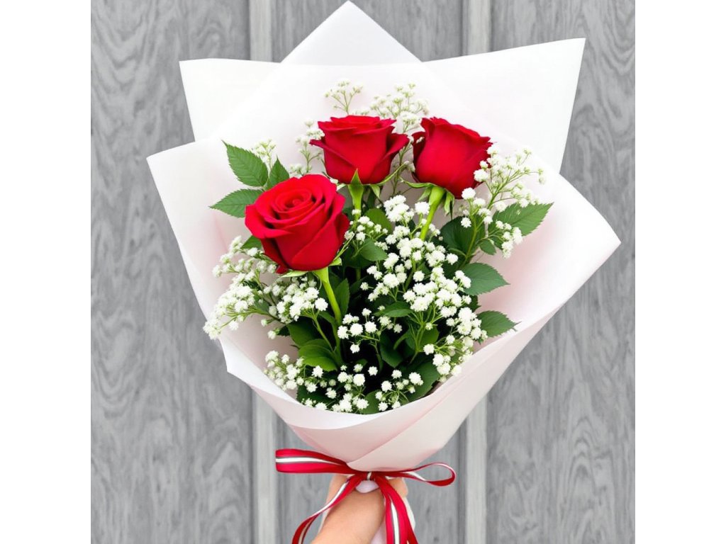 Tento elegantní pugét obsahuje tři nádherné červené růže, doplněné jemnou gypsophilou, která dodává aranžmá romantický a lehký nádech. Červené růže jsou tradičním symbolem lásky a vášně, díky čemuž je tento pugét ideální volbou pro vyjádření hlubokých citů.Celý pugét je aranžován v elegantní manžetě, která mu dodává sofistikovaný vzhled a zaručuje pevnost při předání. Perfektní dárek pro výročí, Valentýn nebo jako romantické překvapení, které vyjádří vaše city s elegancí.